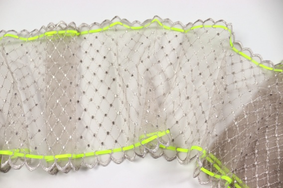 Beżowy haft na stabilnym tiulu z satynową wstążką w kolorze limonki– efektowny materiał dla wymagających!