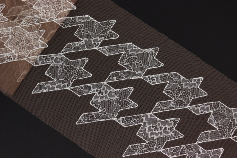 Haft na stabilnym tiulu w kolorze beżowym.