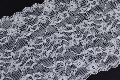 Biała elastyczna koronka w drobne kwiaty.