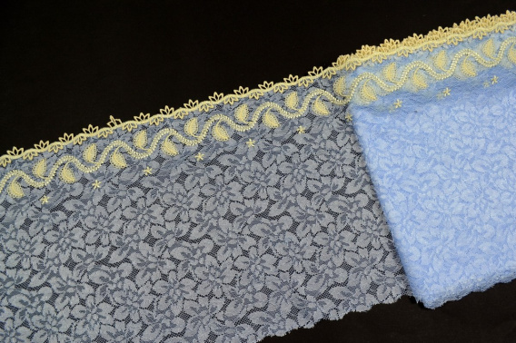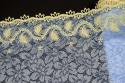 Haft z jednej strony zakończony żółtą gipiurą na błękitnym miękkim tiulu (imitującym koronkę).