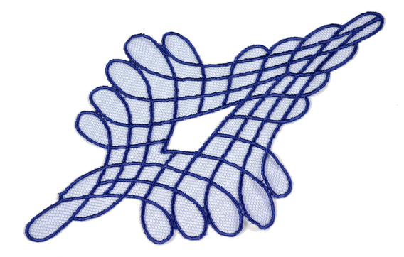 Ciemnoniebieska naszywka haftowana na tiulu.