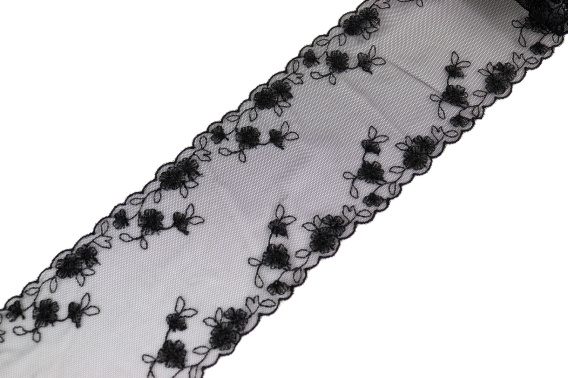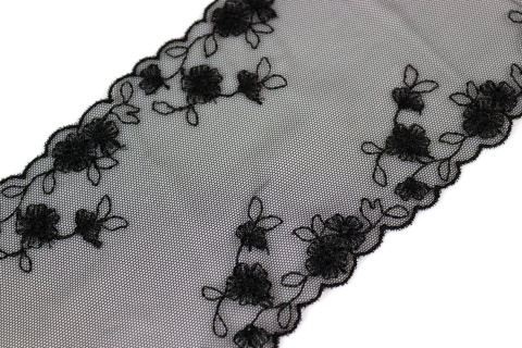 Czarny haft w drobne kwiatki na stabilnym tiulu.
