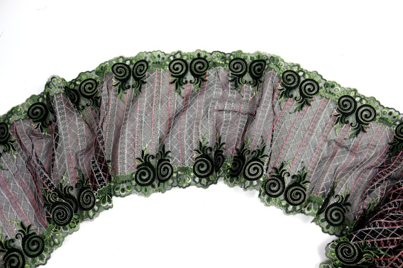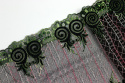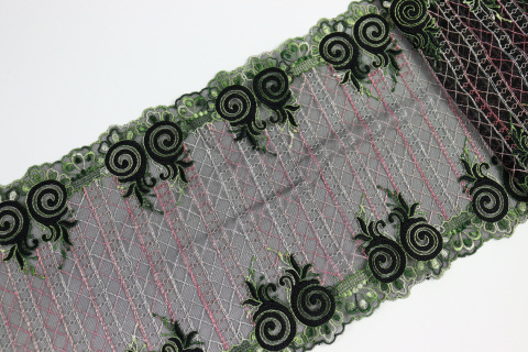 Haft na wyjątkowo rozciągliwym, miękkim tiulu w kolorze czarnym. Wzór wykonany z wypukłej nici nadaje materiałowi wyrafinowany i trójwymiarowy wygląd.