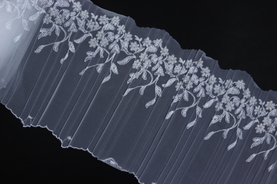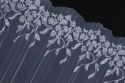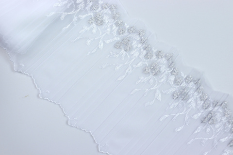Śnieżnobiały haft na elastycznym, gęstym tiulu.