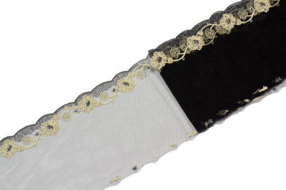 Haft w jasnożółte kwiatki na elastycznym,czarnym tiulu.