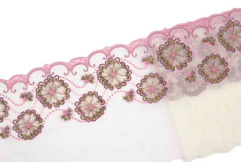 Haft w kwiaty na elastycznym, kremowym tiulu.