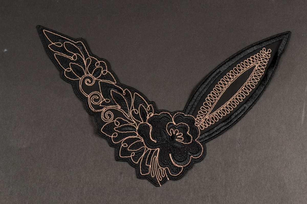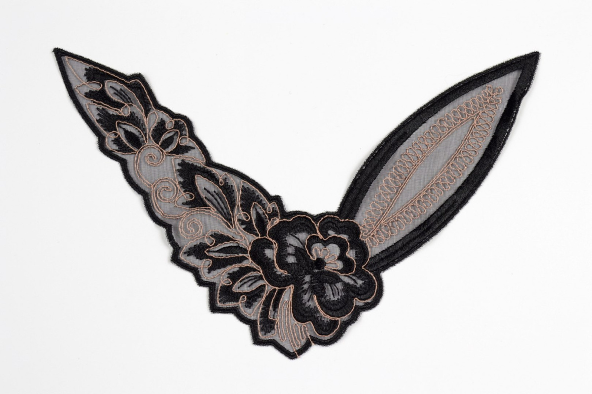 Aplikacje zdobione beżową nicią na czarnym tiulu.