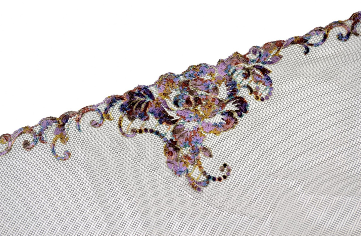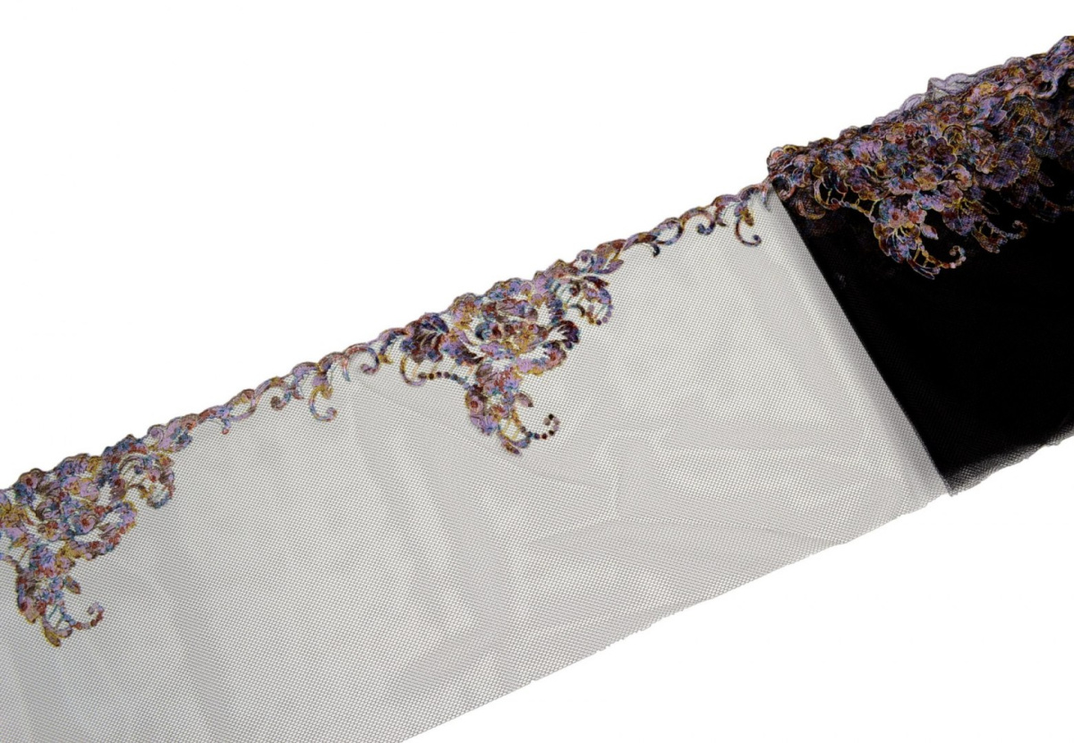 Wzór haftu w wielokolorowe kwiaty. Całość na stabilnym czarnym tiulu.