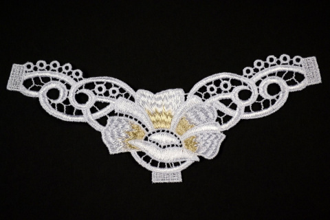 Gipiurowe aplikacje w kolorze białym, środek kwiatka w kolorze beżowym.