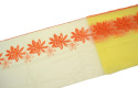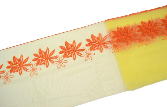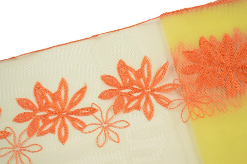 Pomarańczowy haft w kwiaty na stabilnym,żółtym tiulu.