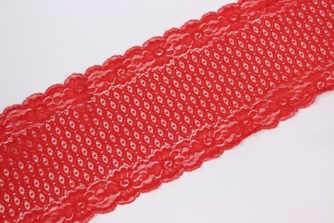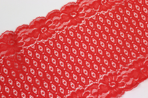 Elastyczna jasnoczerwona koronka z dwóch stron wykończona wzorem w kwiaty.