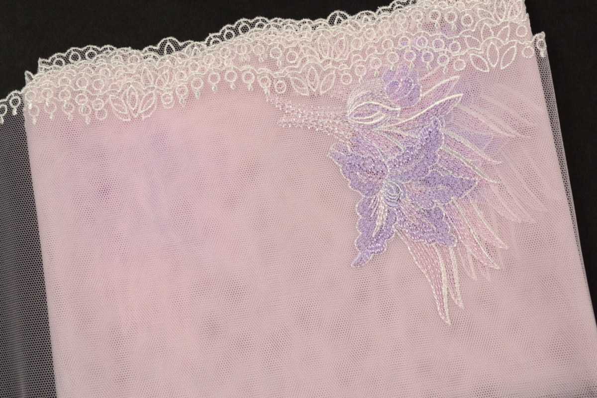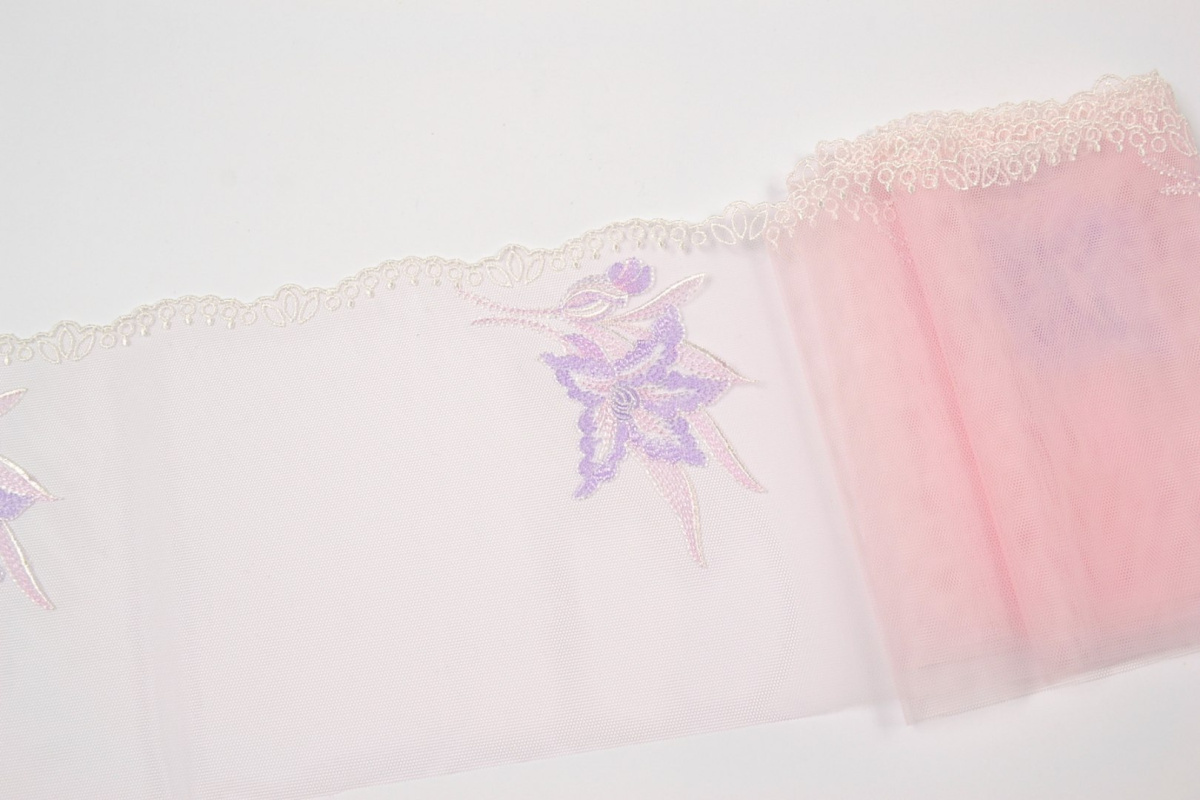 Finezyjny haft na jasnoróżowym,stabilnym tiulu.