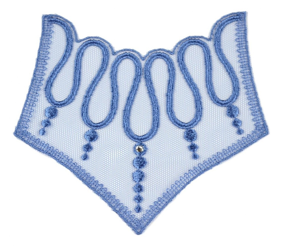 Ciemnoniebieskie naszywki haftowane na tiulu.