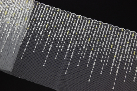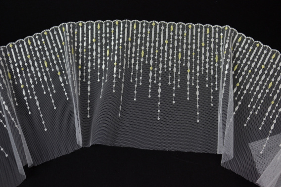 Szeroki stabilny haft na tiulu w kolorze złamanej bieli.
