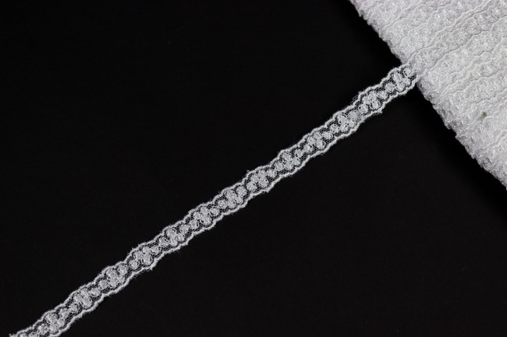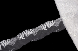 Śnieżnobiała wąska tasiemka ozdobna, haft na tiulu.