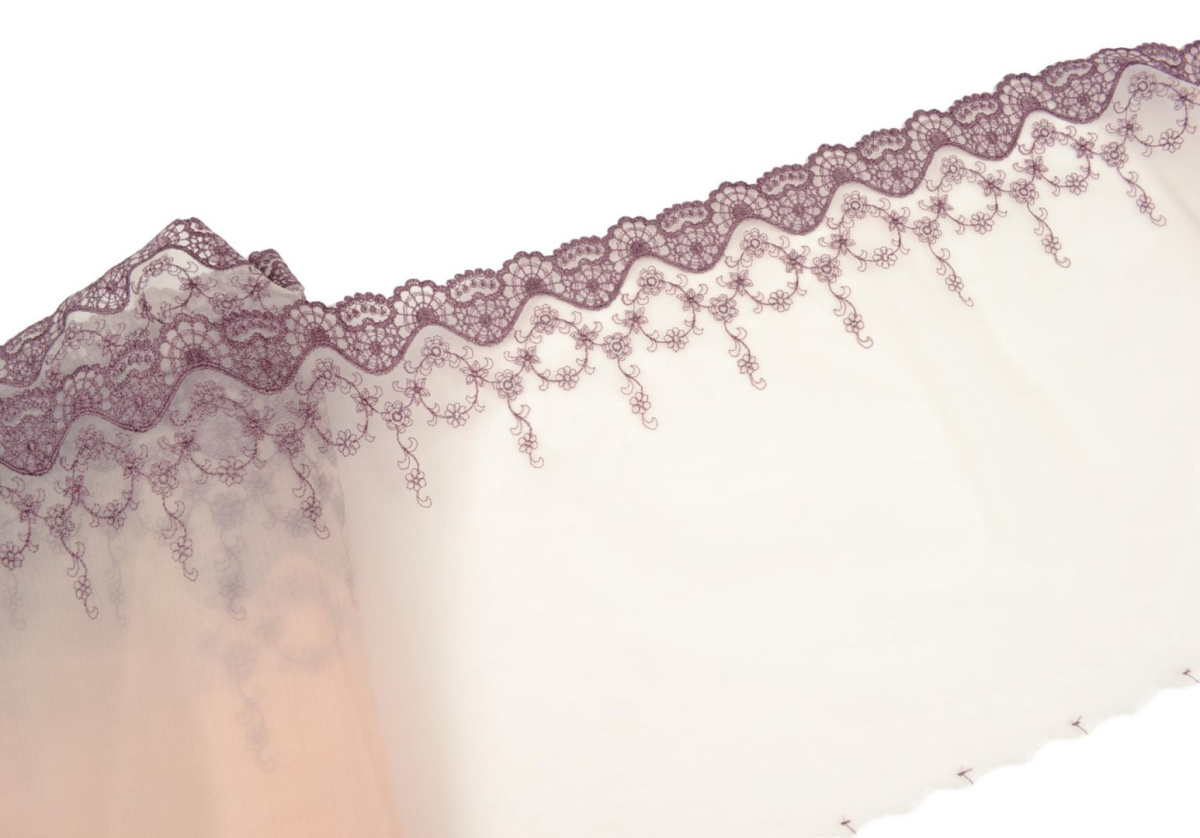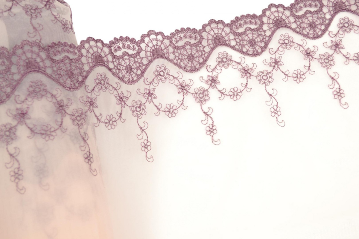 Szeroki haft w liliowy wzór na stabilnym tiulu w kolorze pudrowego różu.