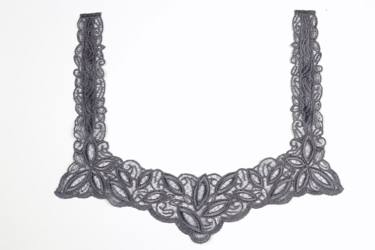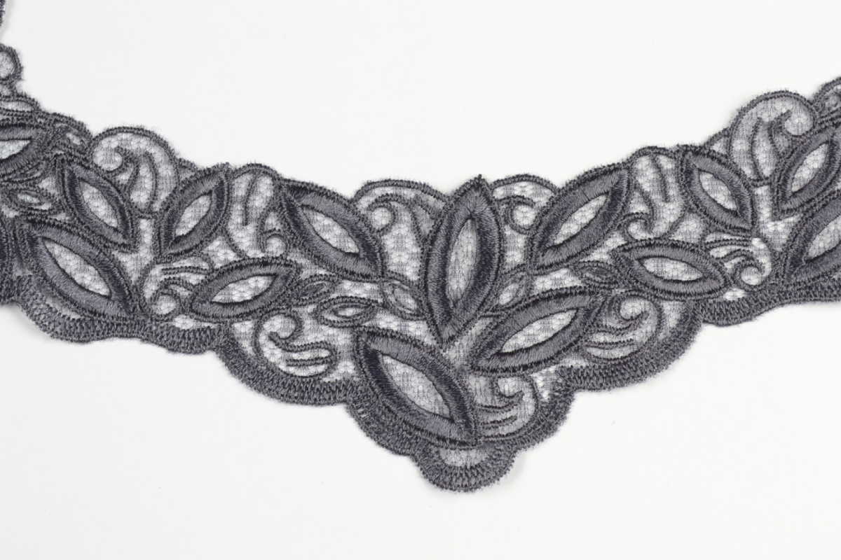 Haftowana naszywka na rzadkim tiulu w kolorze grafitowym.